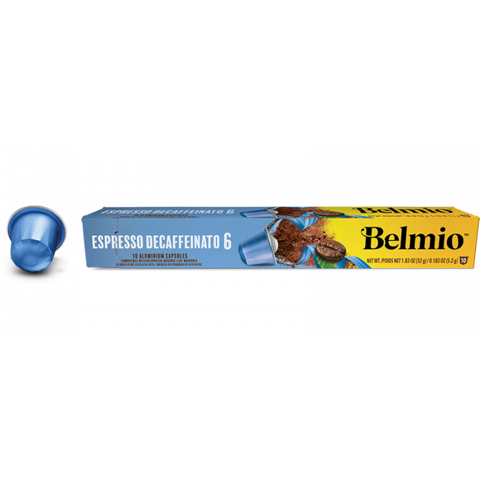 Dëse Belmio Espresso Decaffeinato ass eng entkoffeiniert Kaffi Option fir Nespresso Maschinnen. Jeede Packung enthält 10 Kapselen.